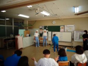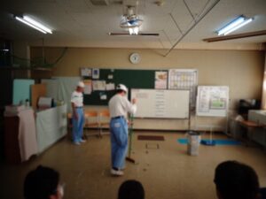 小学部6年生は、西っ子プロ清掃技能検定「自在ほうき部門」での受検を目指して、学習に取り組んでいます。その中で自在ほうきについて高等部の先輩から学ぼうと今回の授業が実施されました。