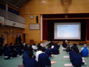2月27日(金)、生徒会執行部と体育、保健、文化、給食、美化の各委員会が、活動報告を発表し合いました。