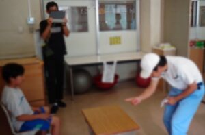 今回の授業では、示範の場面では、クラスごとに分かれるため、講師もそれぞれのグループへ。一人で講師を務めることになり、いつも以上に緊張した生徒たちでしたが、いざ示範になると岡山県技能検定の机拭きの検定内容に従って、落ち着いて示範することができました。その後は、小学部児童の机拭きの様子を見ながら、雑巾の持ち方や拭き方のアドバイスをするなど、講師としての役割をしっかりと果すことができました。