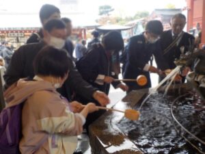 1日目は浅草寺と東京スカイツリーの見学を行いました。貸切バスでは、ガイドさんの説明を聞きながら、皇居や国会議事堂など、基礎学習で学習した場所を車窓から眺めることができました。