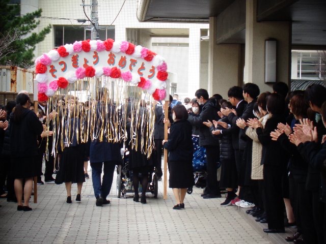 花道でのエールを受け、校門を後にする卒業生。新たな人生のステージに向けた旅立ちの日を祝福するように、やわらかな光がその姿を包んでいました。