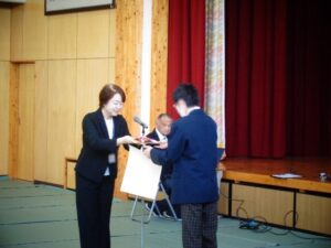 校長先生のお話を聞いた後、修了証書を各部代表の児童・生徒が受け取りました。その後、令和7年度自転車鍵かけコンテストで最優秀賞を受賞した高等部の表彰がありました。