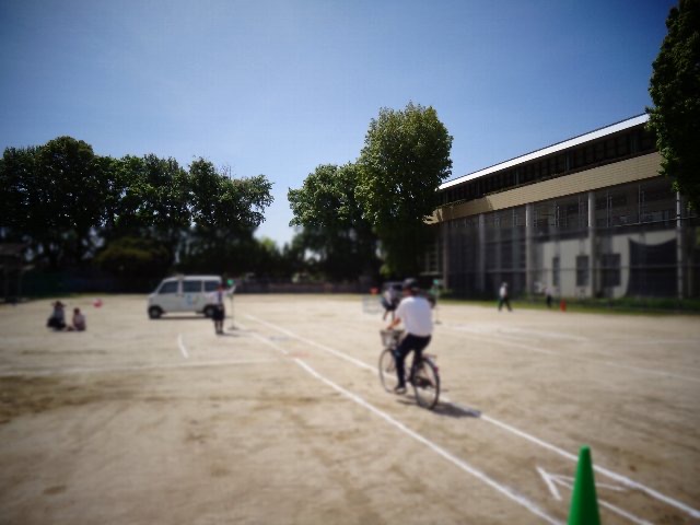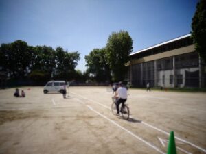 ひらた旭川荘グラウンドに描かれた道路や設置された信号機などを使って、交差点の横断や一時停止など、交通安全で特に気をつけるべきポイントを中心に交通ルールを確認しながら、講師の方の実演を見たり、自転車や徒歩での実地指導を受けたりしました。